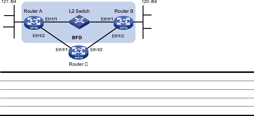 route to subnet 121::/64 on Router B. Enable BFD for both routes. Configure an IPv6 static route to subnet