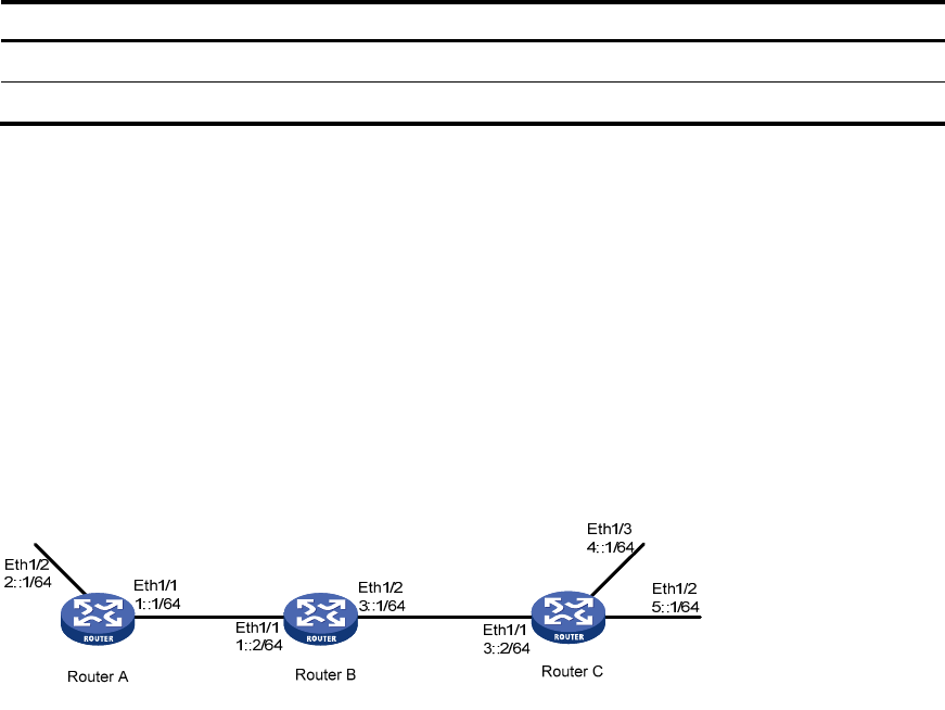 As shown in Figure 83, all routers learn IPv6 routing information through RIPng. Configure Router B to