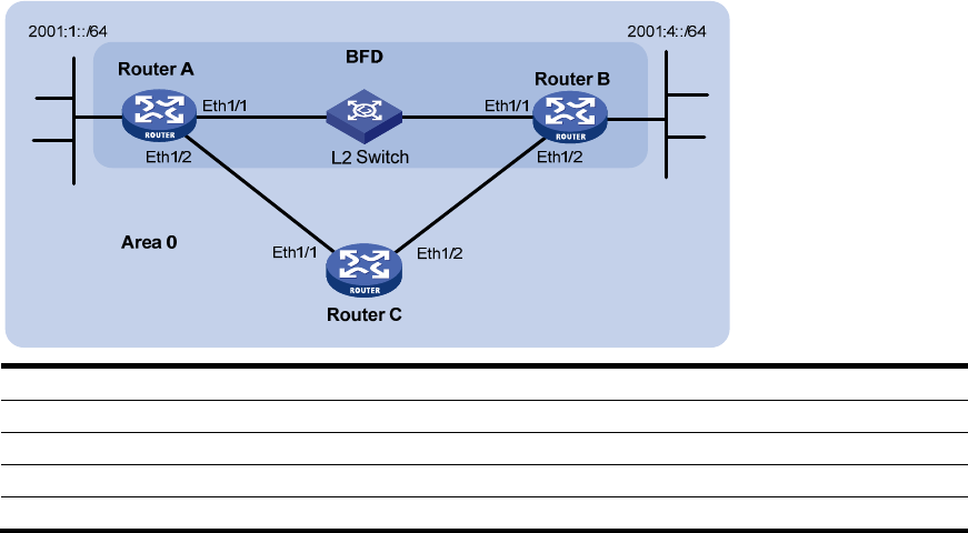 • Configure OSPFv3 on Router A, Router B and Router C and configure BFD over the link Router
