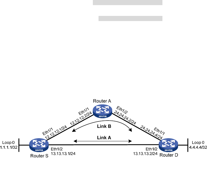 As shown in Figure 14, Router S, Router A, and Router D run RIPv2. Configure RIP FRR so that when Link