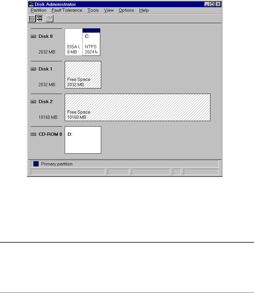 In the following example, Disk 1 has been partitioned and Disk Administrator assigned a temporary