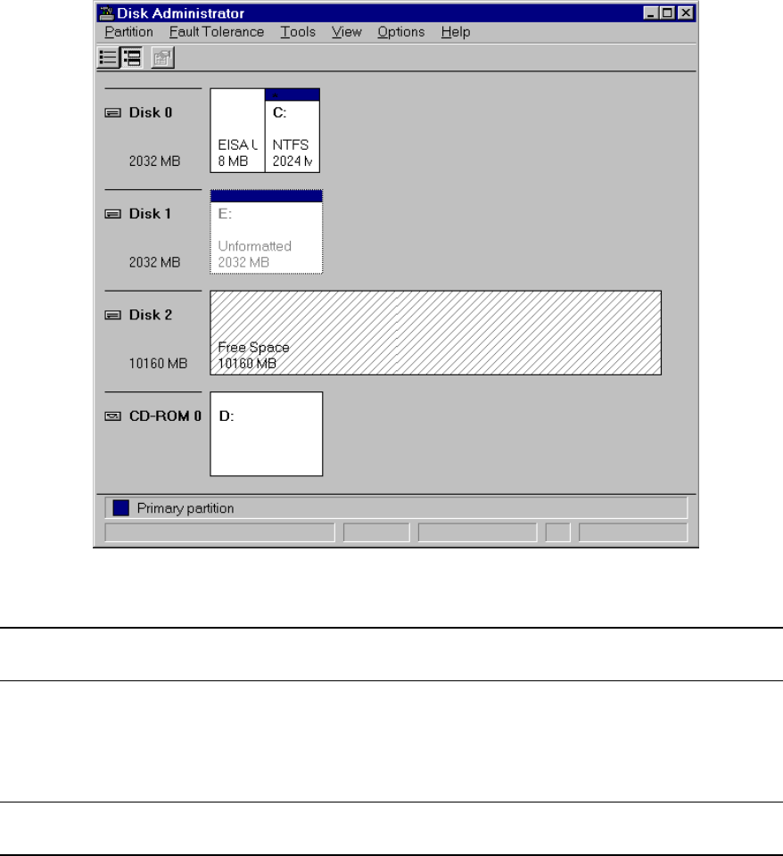 NOTE In the following example, Disk 2 has been partitioned and Disk Administrator assigned