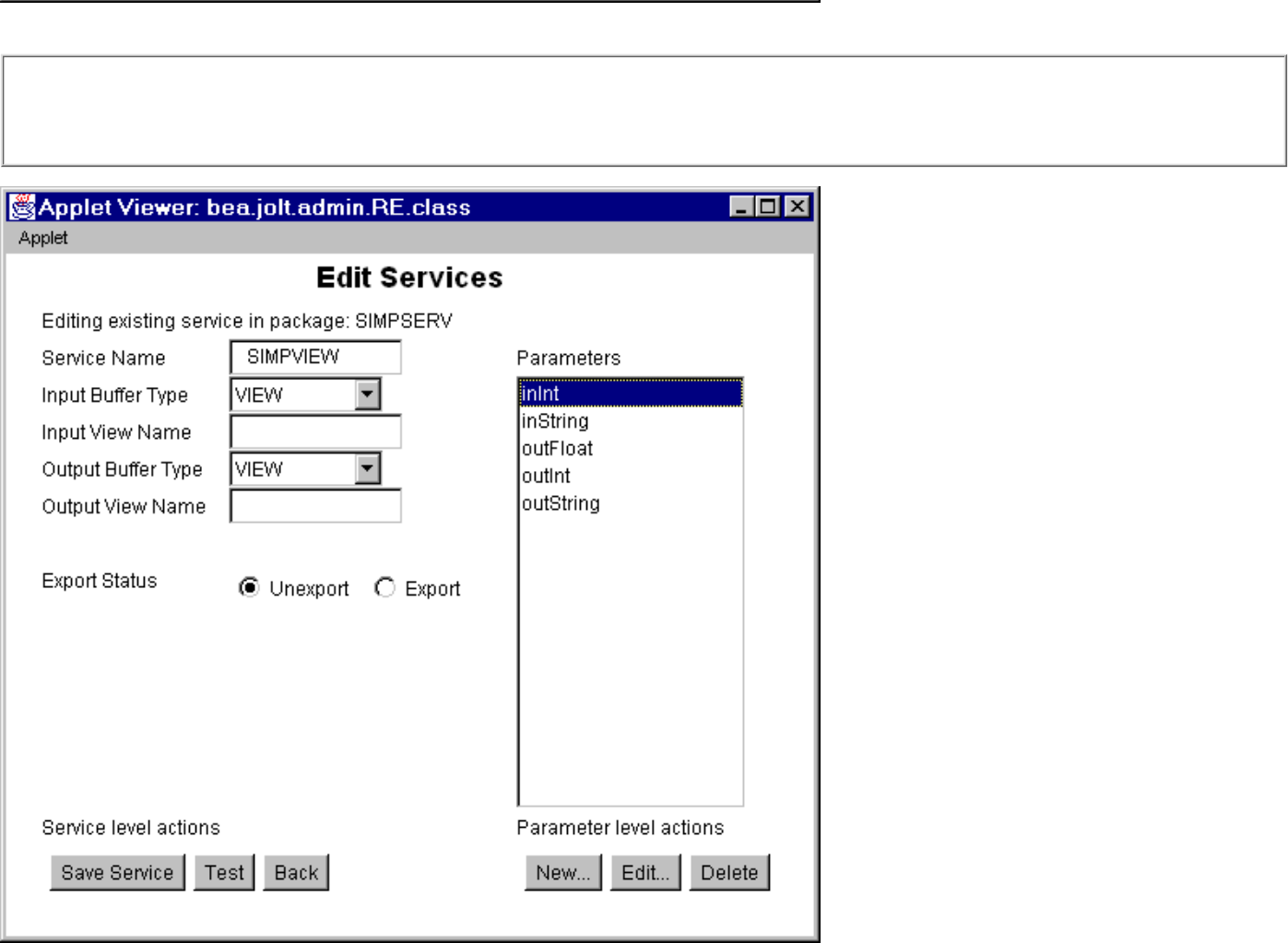 Define the parameters for the VIEW service. In this example, the parameters are: cname, inString, inInt, inFloat, outString, outInt, outFloat.