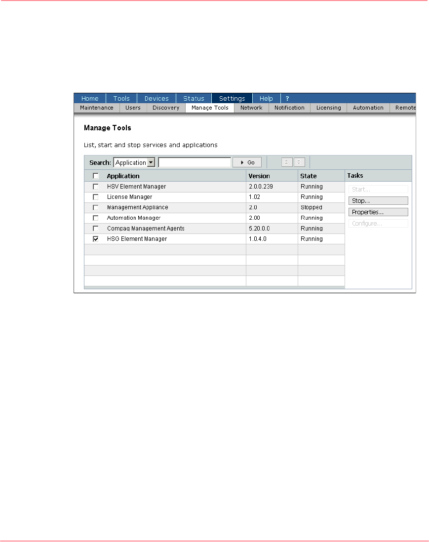 Tools page (Settings > Manage Tools) to start or stop applications and view