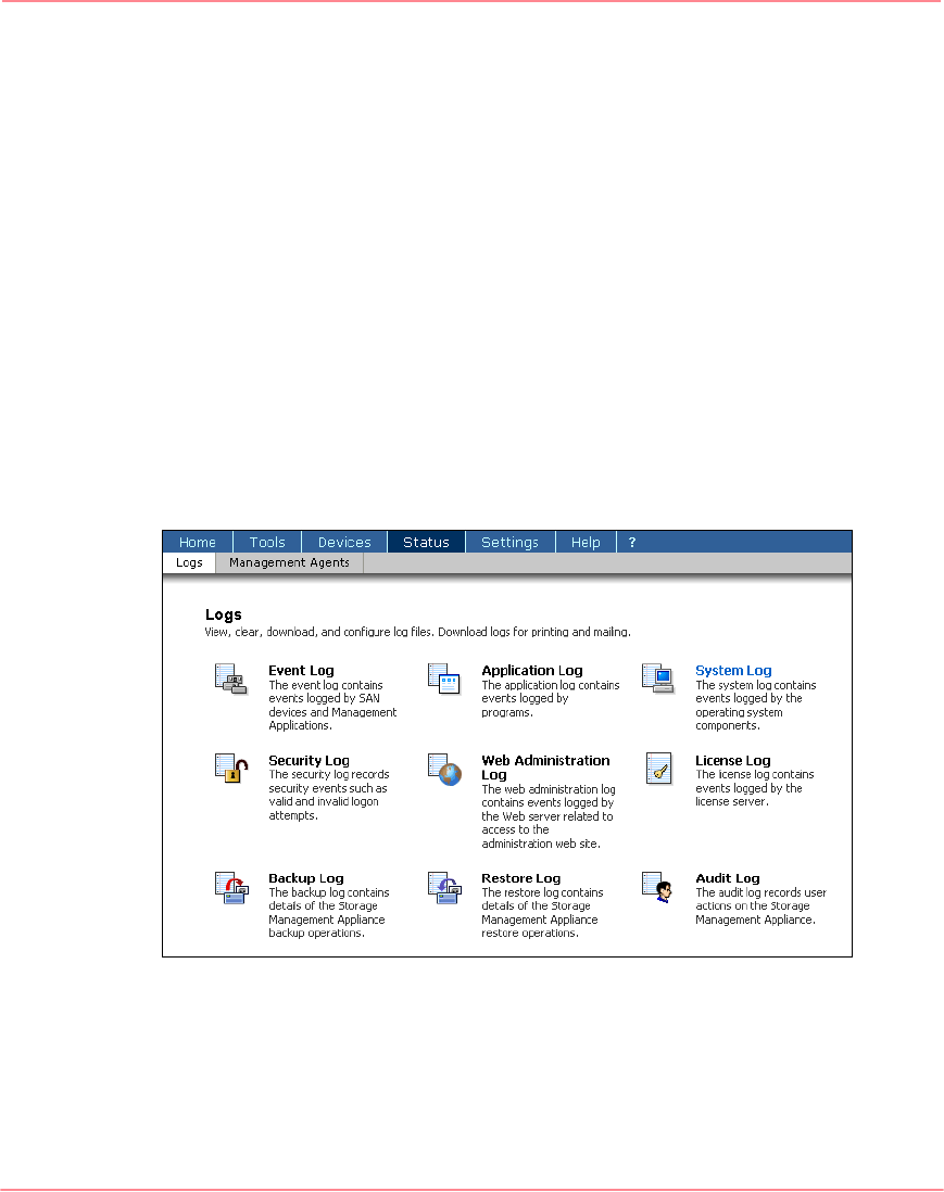 Access any log by clicking Status on the primary navigation bar and then Logs on
