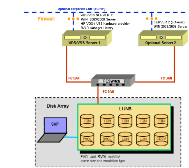 • HP Storage Disk Array with Business Copy and Snapshot license installed by HP. For supported