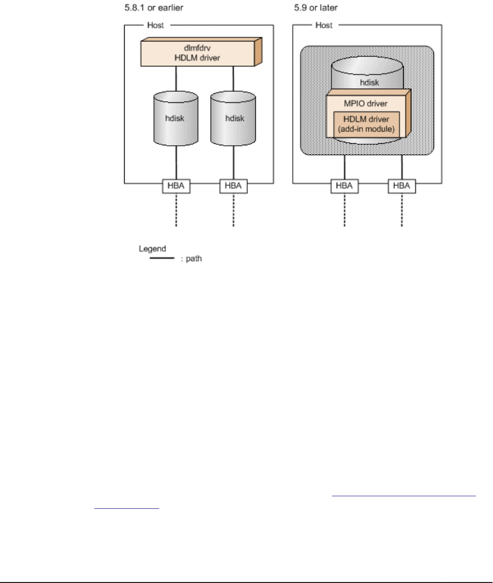 HDLM version 5.9 or later supports MPIO used by AIX 5L V5.2 or later. This