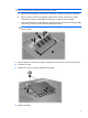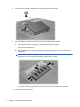 . Lift the memory module compartment cover (2) away from the computer. 9. If you are replacing a memory module, remove the existing memory module: a. Pull away the retention clips (1) on each side of the memory module. The memory module tilts up. b. Grasp the edge of the memory module (2), and gently pull the module out of the memory module slot. CAUTION: To prevent damage to the memory module, hold the memory module by the edges only. Do not touch the components on the memory module.