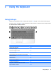 2 Using the keyboard Using hotkeys Hotkeys are combinations of the fn key (1) and either the esc key (2) or one of the function keys (3). The icons on the f1 through f12 keys represent the hotkey functions. Hotkey functions and procedures are discussed in the following sections. Function Hotkey Display system information. fn+esc Open Help and Support. fn+f1 Open the Print Options window. fn+f2 Open a Web browser. fn+f3 Alternate between computer display and external display.