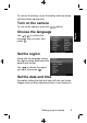 To remove the battery, move the battery latch as shown until the battery springs free. Turn on the camera To turn on the camera, press the button. English Choose the language Use to choose the language that you want, then press . Set the region Along with the language setting, the region setting determines the default date format. to choose the region Use you want, then press .