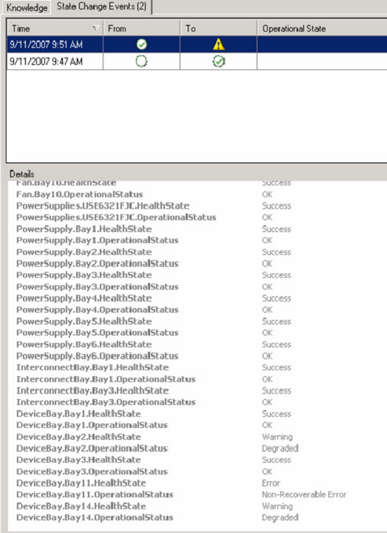 The following figure is an example of Health State Change history and state property data. The Details