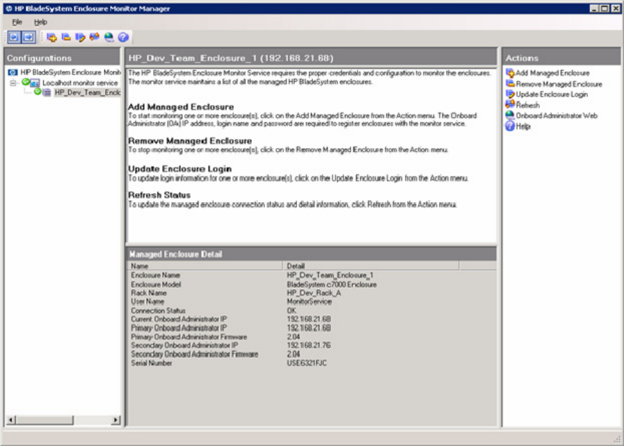 node of the HP BladeSystem Enclosure Monitor Manager. The second level lists all connected