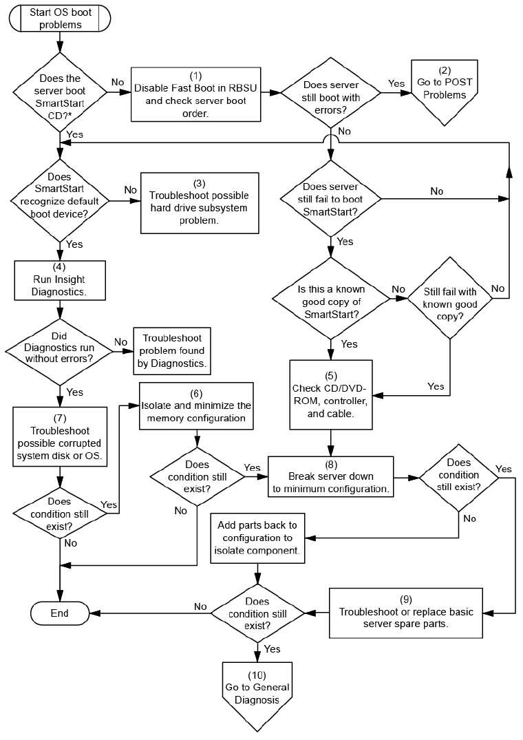 • Server boots, but the internal health LED, external health LED, or component health LED is red or amber