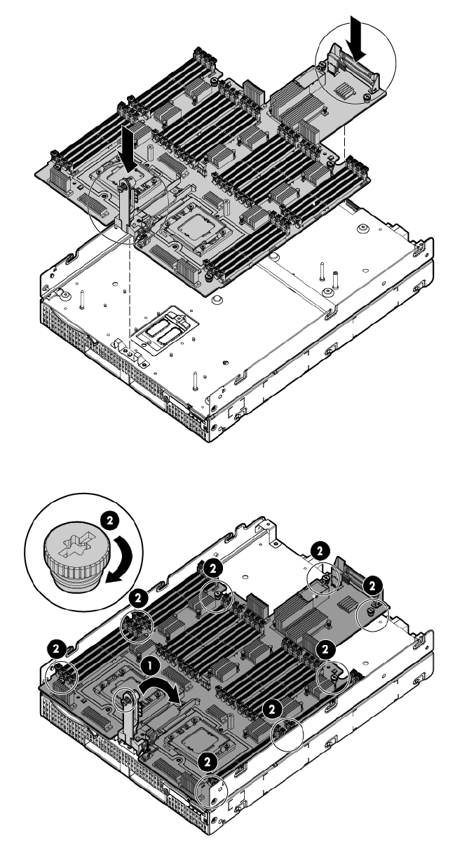 2. Lower the front handle, and then tighten the handle thumbscrew and the system board thumbscrews.