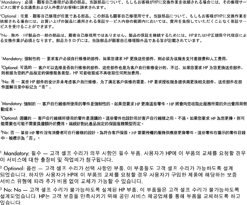 Mandatory: Obrigatória—Peças cujo reparo feito pelo cliente é obrigatório. Se desejar que a HP substitua essas peças,