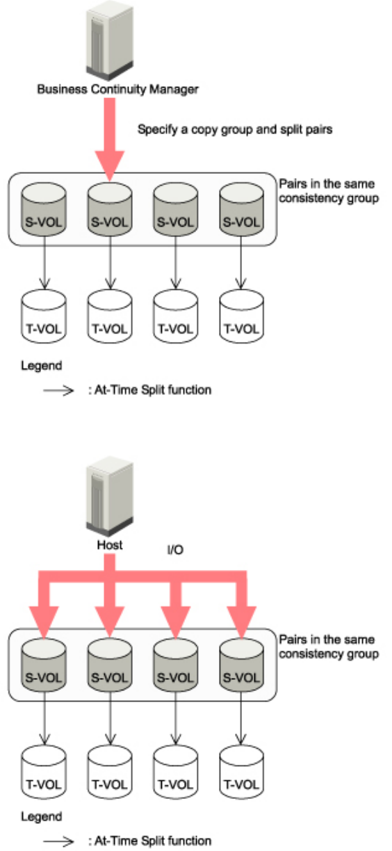 simultaneously. The T-VOLs will contain the same data as the S-VOLs when the pairs are split.