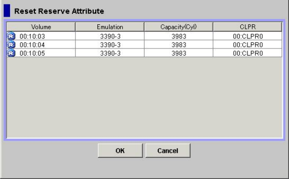 The Reset Reserve Attribute dialog box displays the reserved volumes that you selected in the Pair