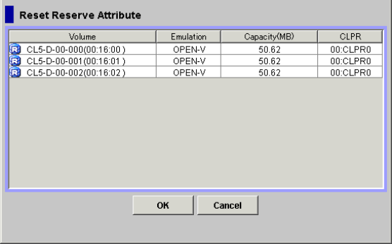 The Reset Reserve Attribute dialog box displays the reserved volumes that you selected on the Pair