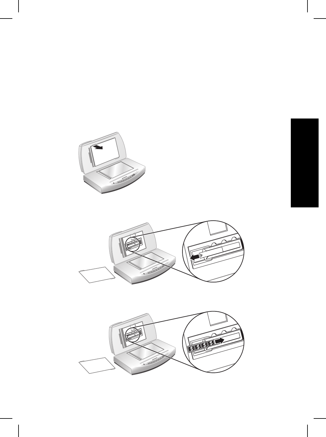 3. Introduceţi o bandă de negative în suport astfel încât, după închiderea capacului,