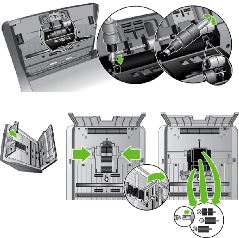 7. Remove any visible lint or dust from the rollers and their housing using either compressed air or