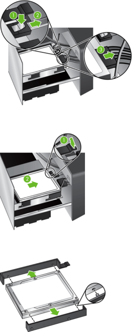 5. To remove the drive, gently lift the drive rail lever on the left leading edge of the drive (1), slide
