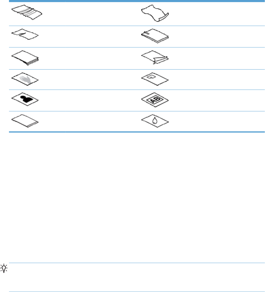 Scanning the following types of documents might result in paper jams or damage to the