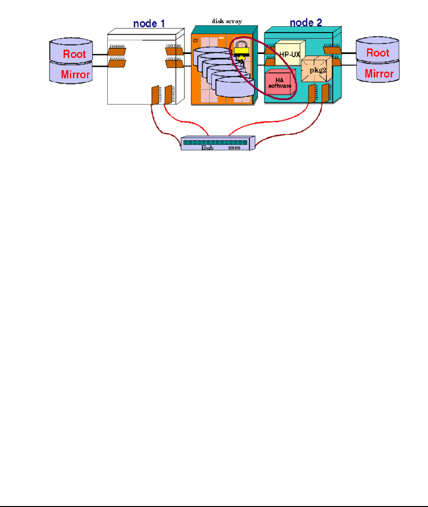 circuits for a two-node cluster, with a single, separately powered disk for