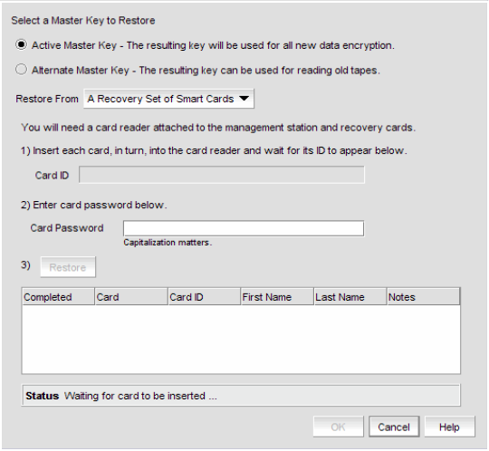 FIGURE 66 Select a Master Key to Restore (from a recovery set of smart cards) dialog box