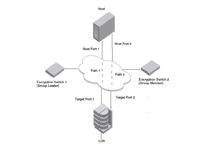 a dual-port host. The two encryption switches form an encryption group and an HA cluster. The