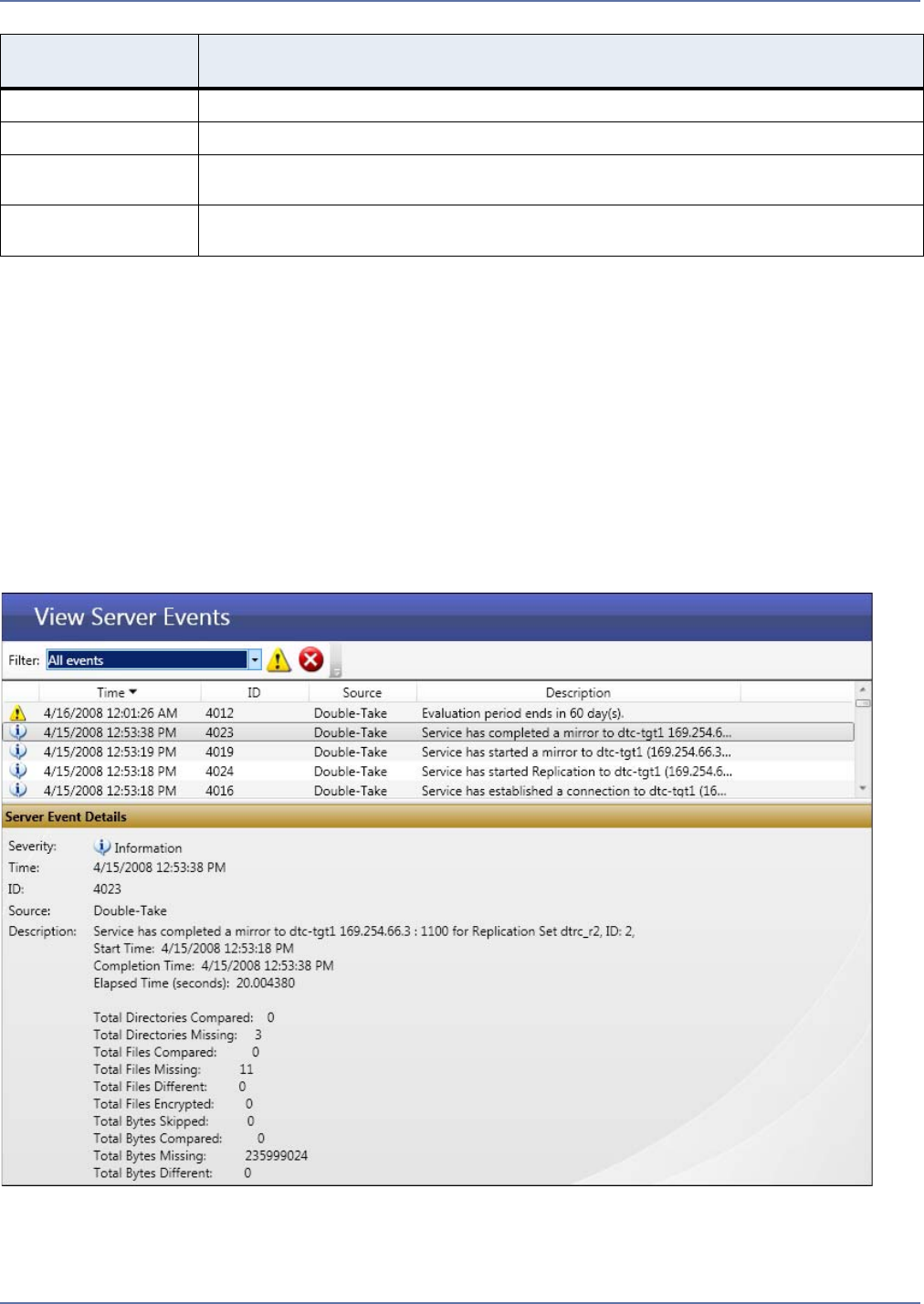On the View server events page, you can view the Storage Mirroring event messages logged to the
