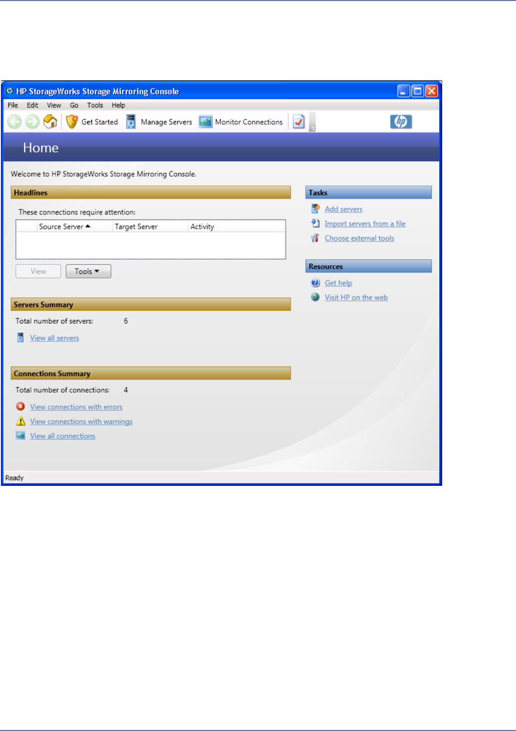 To begin using Storage Mirroring Console, click the Get Started button on the main toolbar, or select
