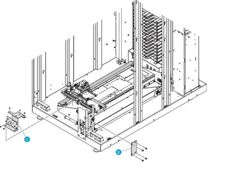 8. From the front of the library, remove two shipping restraints using a #2 Phillips screwdriver (see