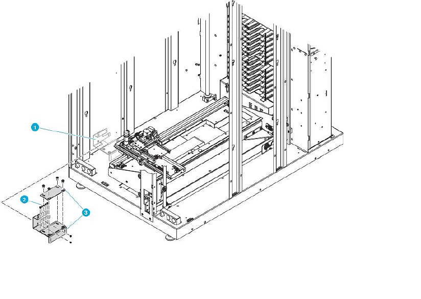 11. Use the remaining two screws to secure the combined shipping restraints in the library, as shown