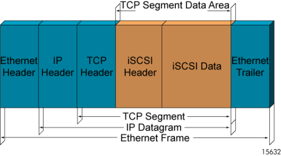 iSCSI PDUs are inserted in the TCP segment data area of IP datagrams. The IP datagrams are then