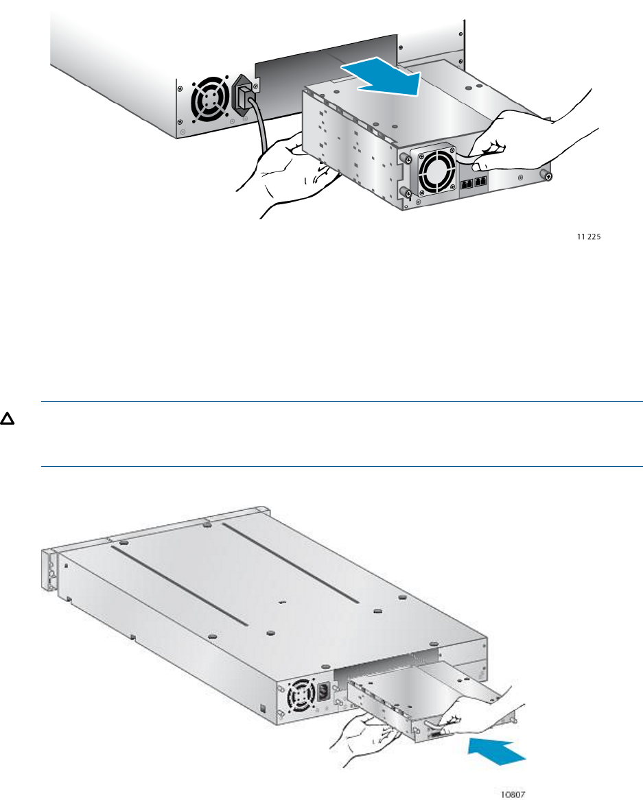 6. Pull straight back on the tape drive handle to remove the tape drive from the library (see