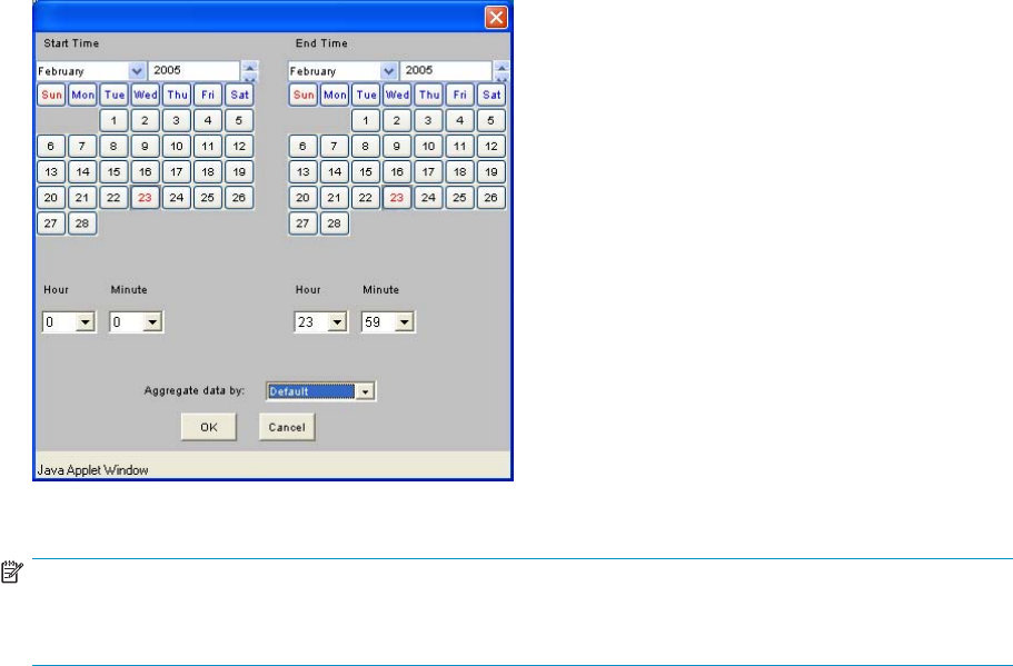 day, year, hour, and minute (start and end times) for receiving data on perform ance alarms, as shown in