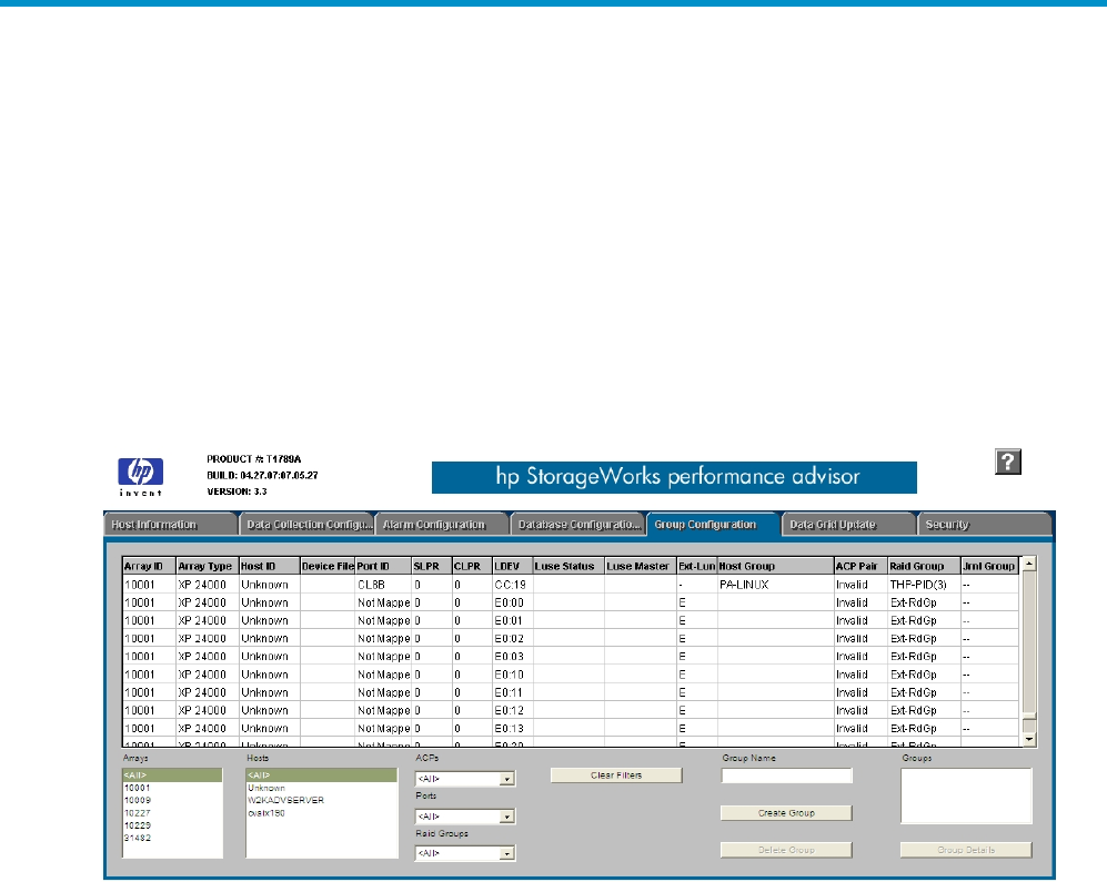 as shown in Group Config uration screen. Use this screen to group host and array components, and to