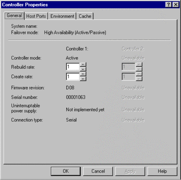 Controller has four property sheets: General, Host Ports, Environment, and