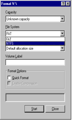 2. Select a file system and click Start to begin the format process. A