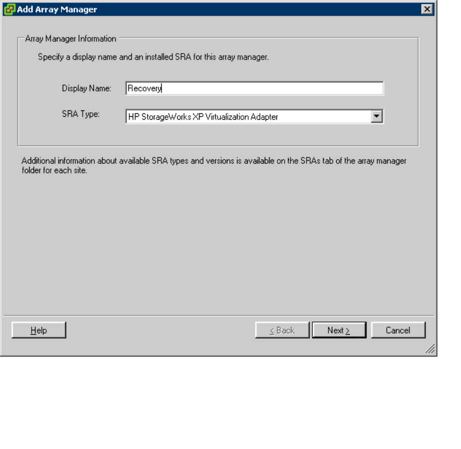 Name and Select RAID Manager Storage Replication Adapter from an SRA Type that is