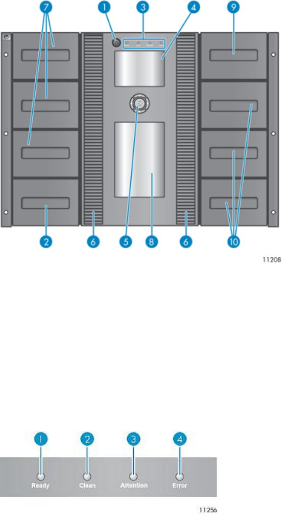 Ready. Illuminated when power is on. Blinking when there is tape drive or robotics activity.Green1.