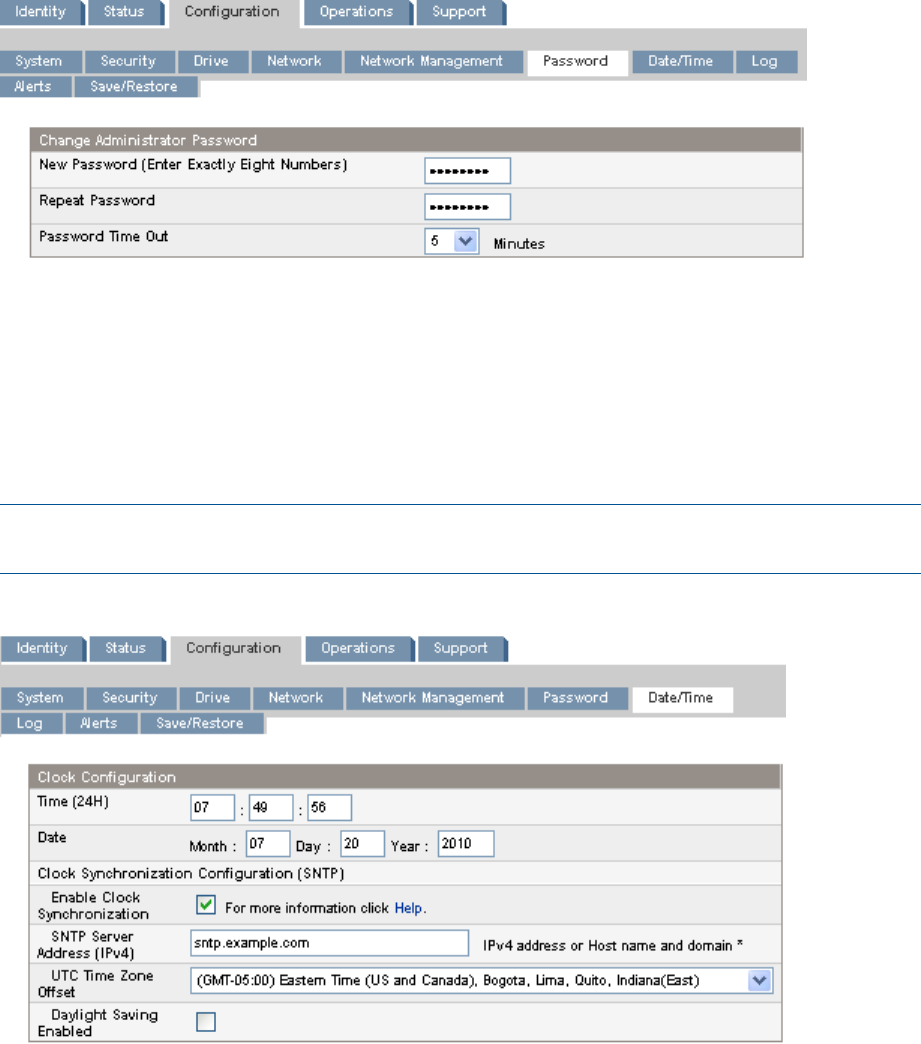 • Time — configures the hours, minutes, and seconds for the internal clock. The time is based