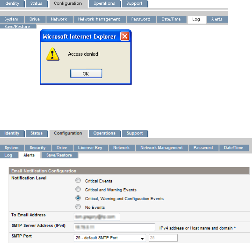 The Configuration: Log page can only be accessed by HP Service personnel.