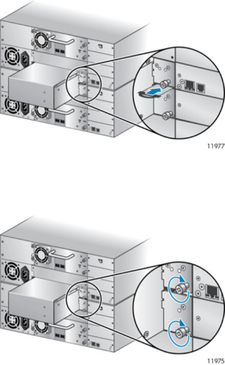 6. Attach a power cable to each power connector on the back panels of the Libraries. Plug the