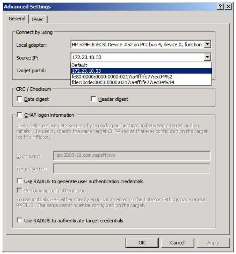 Select the IP address for the adapter from Source IP.