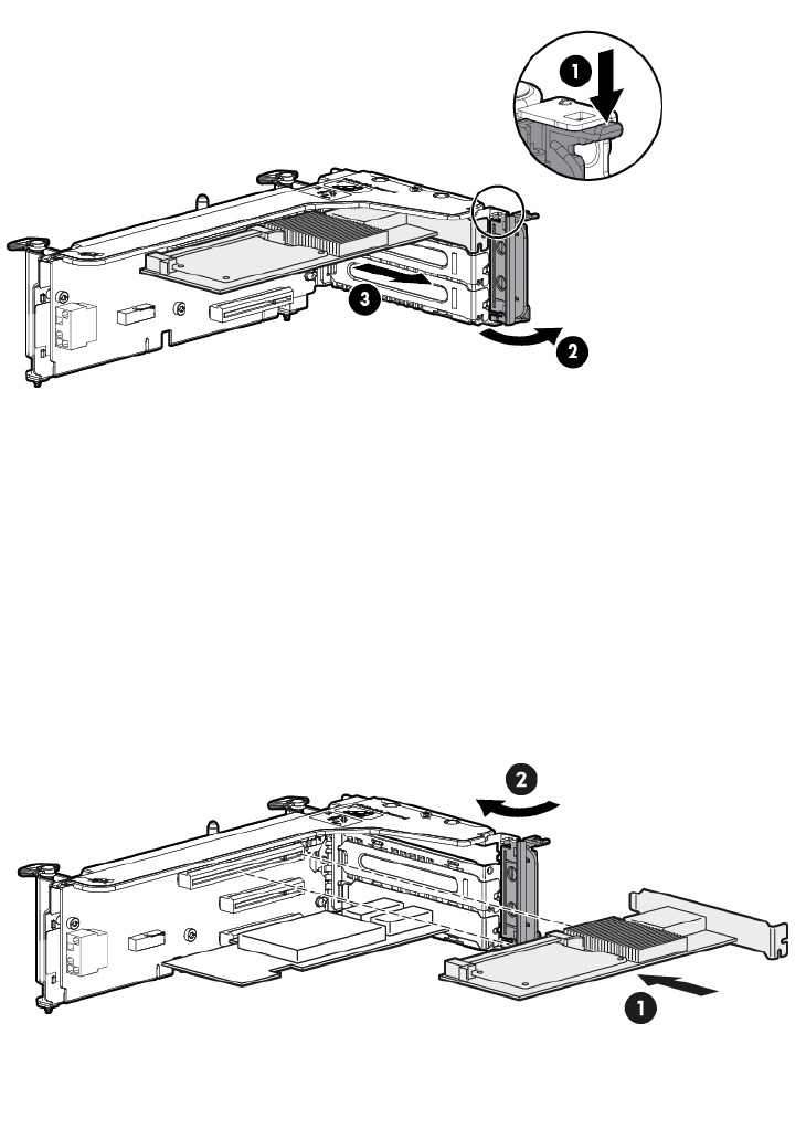 3. Unclip the blue retaining latch on the PCIe card (1 and 2) and remove the PCIe card (3).