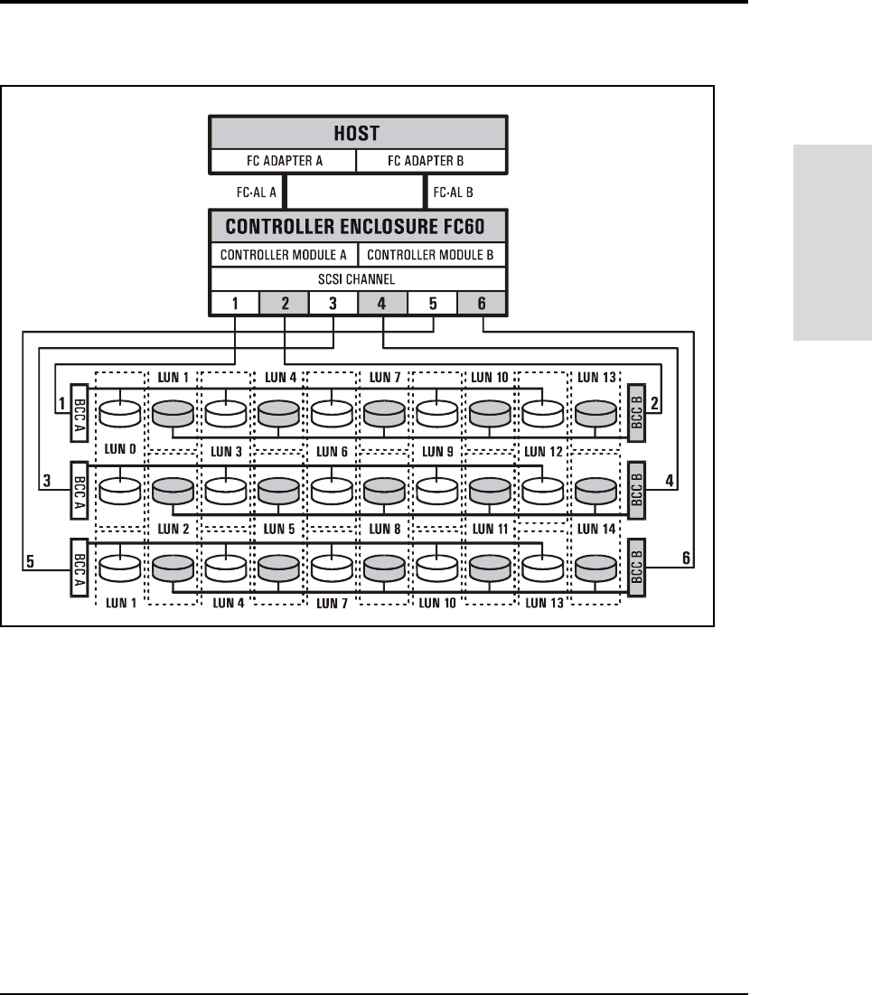 For high-availability, one disk per SCSI channel is used as a global hot spare.