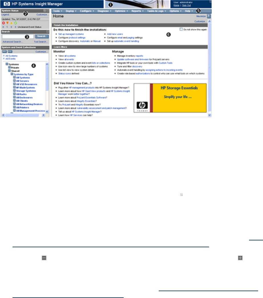 1. Banner The banner provides a link to the Home page, a link to Sign Out of HP SIM, and displays