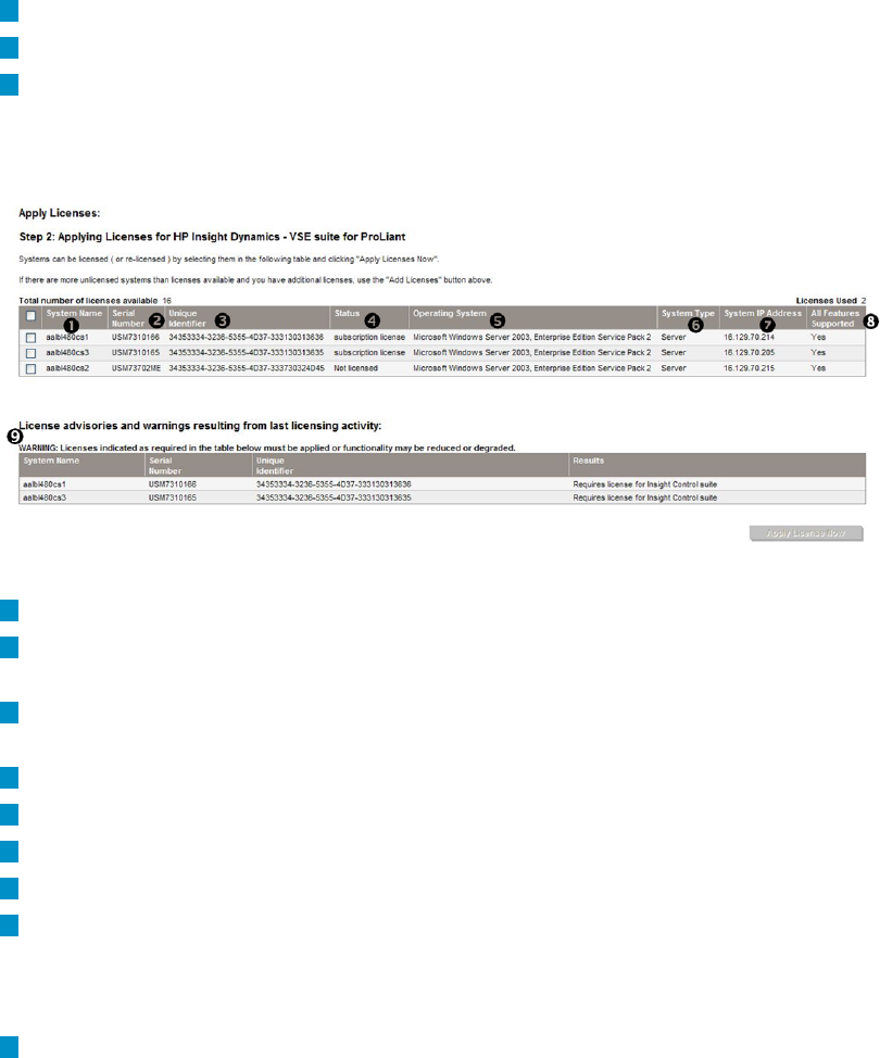 License advisories and warnings resulting from last licensing activity: Table that indicates
