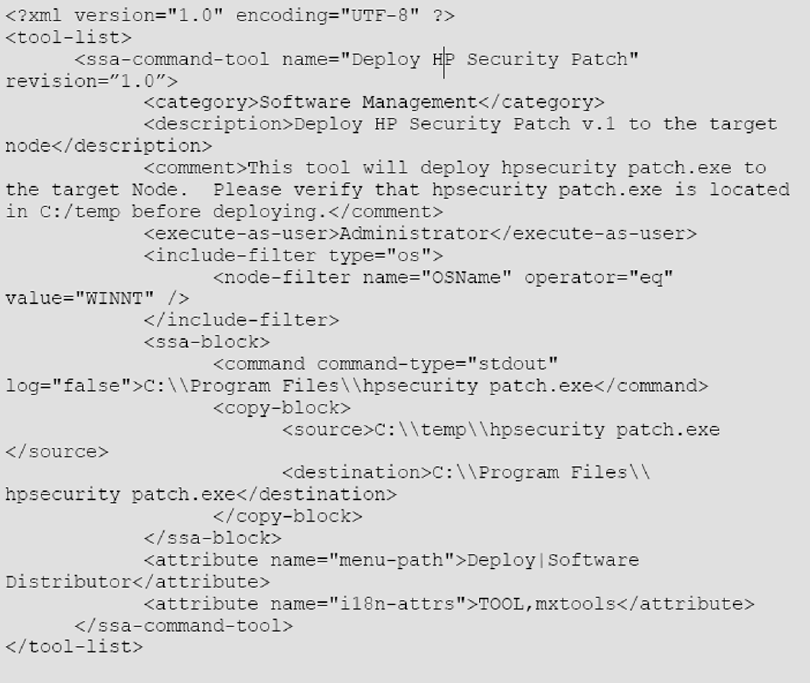 The fully composed TDEF for a SSA copy tool to deploy the HP Security Patch to a managed